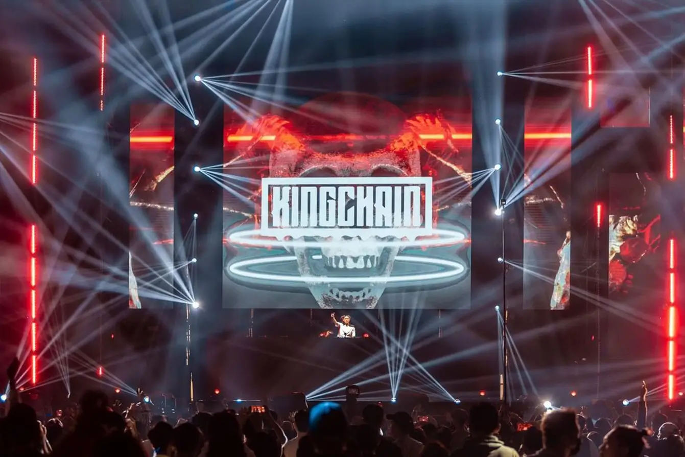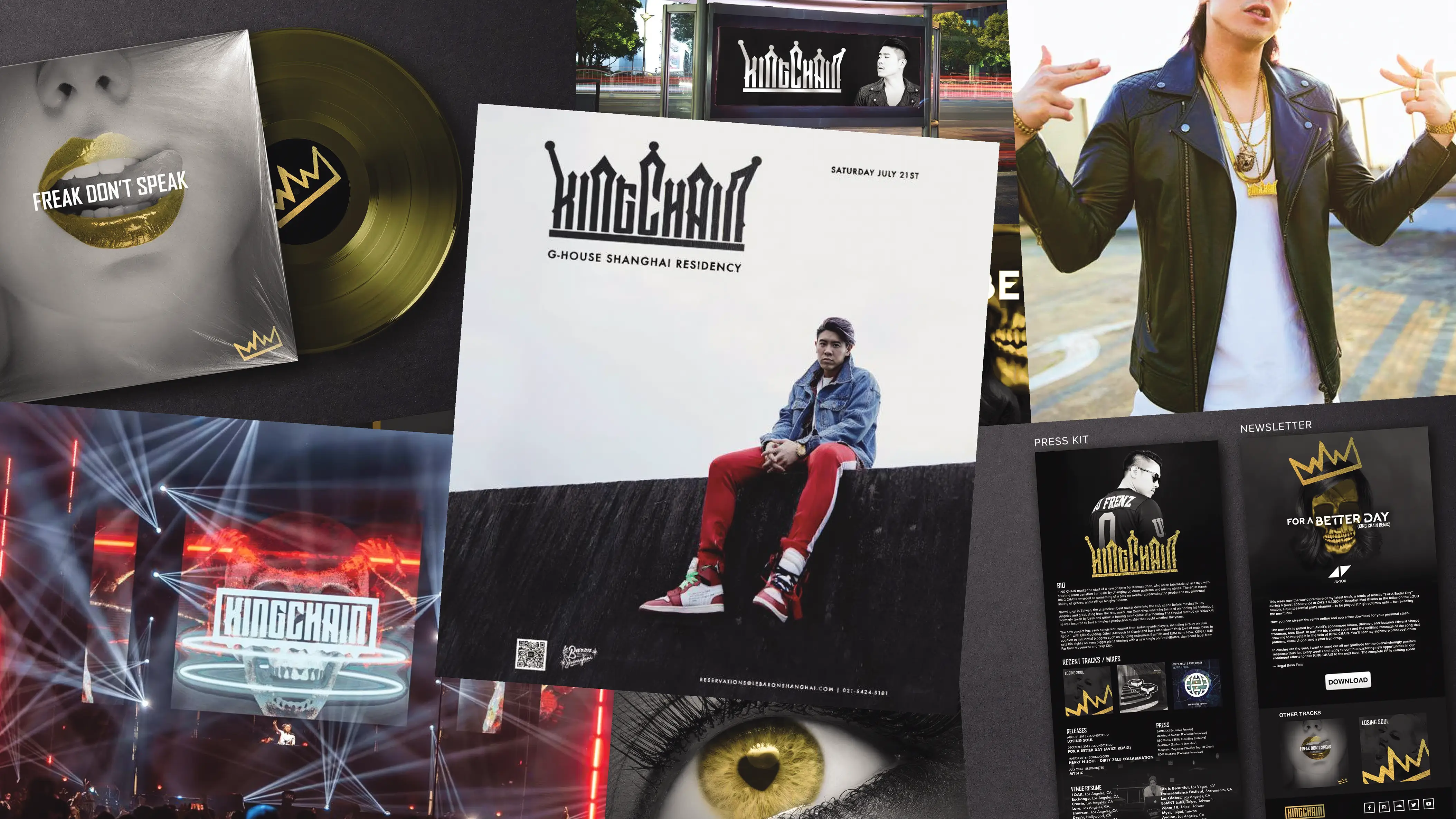 A complete artist identity system for KINGCHAIN, a Reno-based recording artist. The identity creates a distinctive visual world that bridges music, fashion, and digital culture through bold typography and a signature mark system.