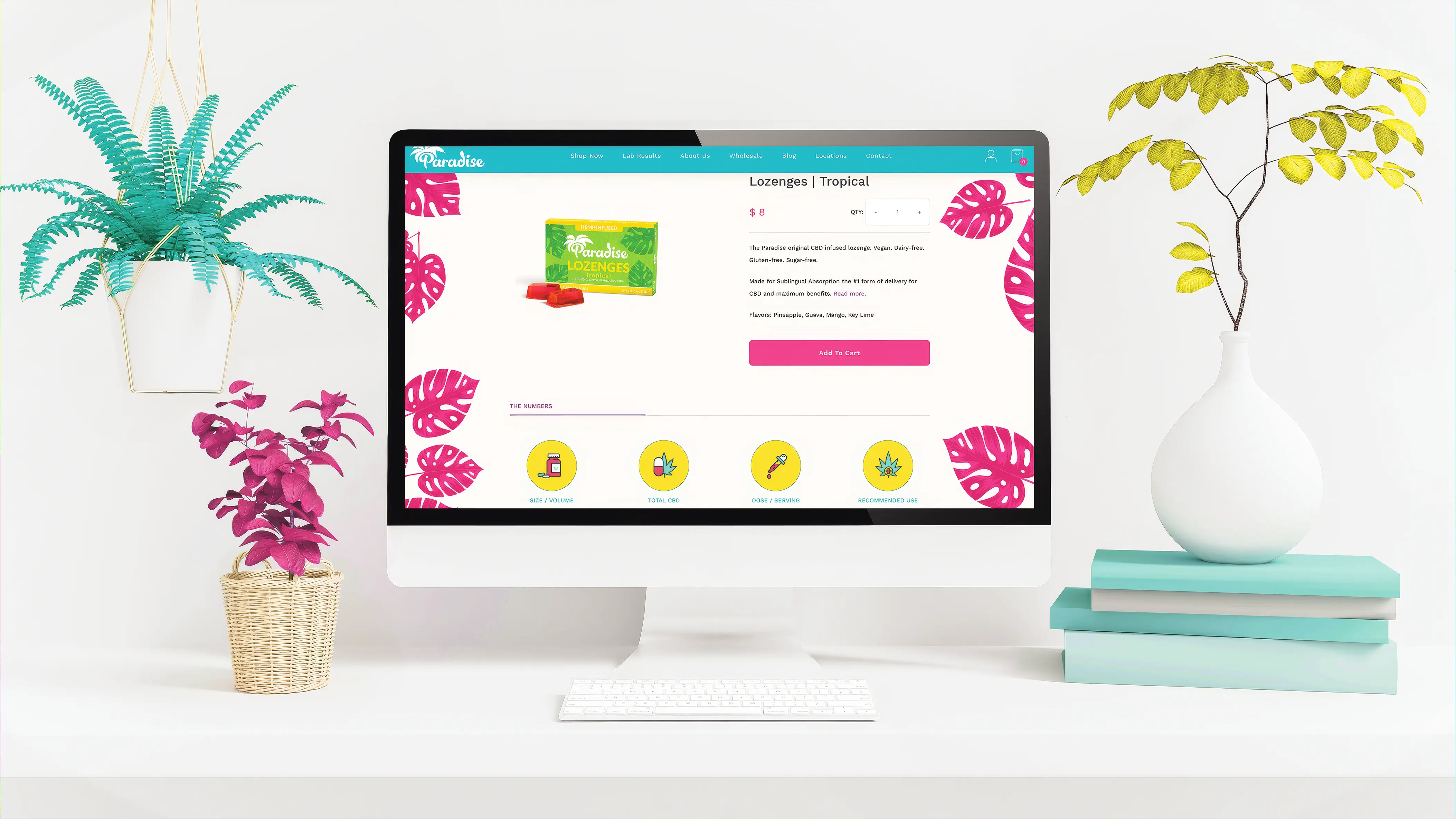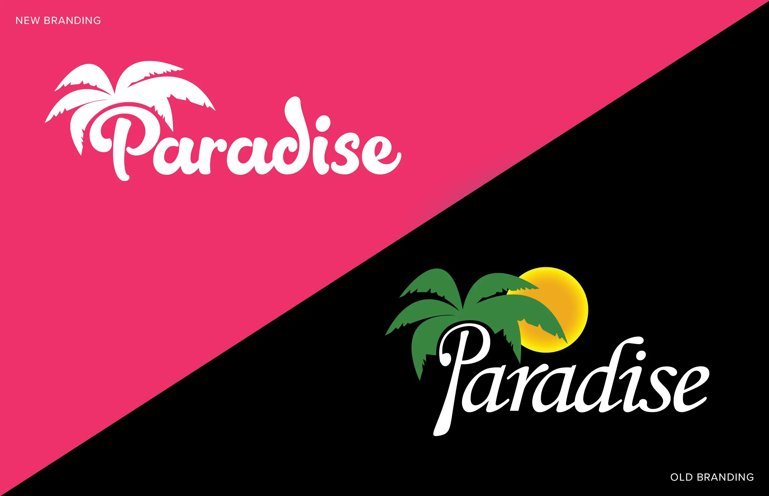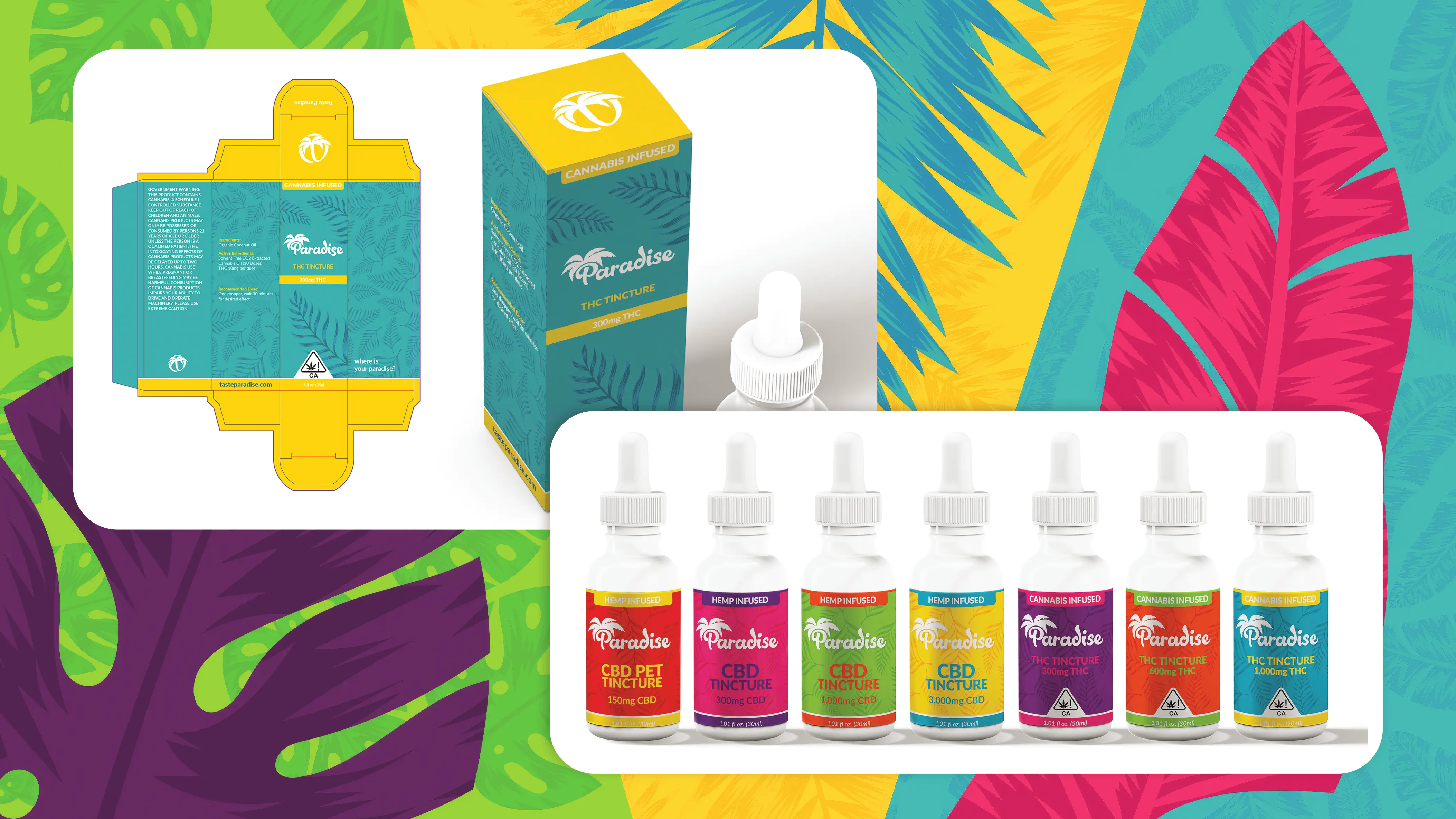 A vibrant brand identity for Paradise Candy, a cannabis-infused confection line targeting the lifestyle market. The brand communicates joy and quality through bright color, playful typography, and distinctive product packaging.