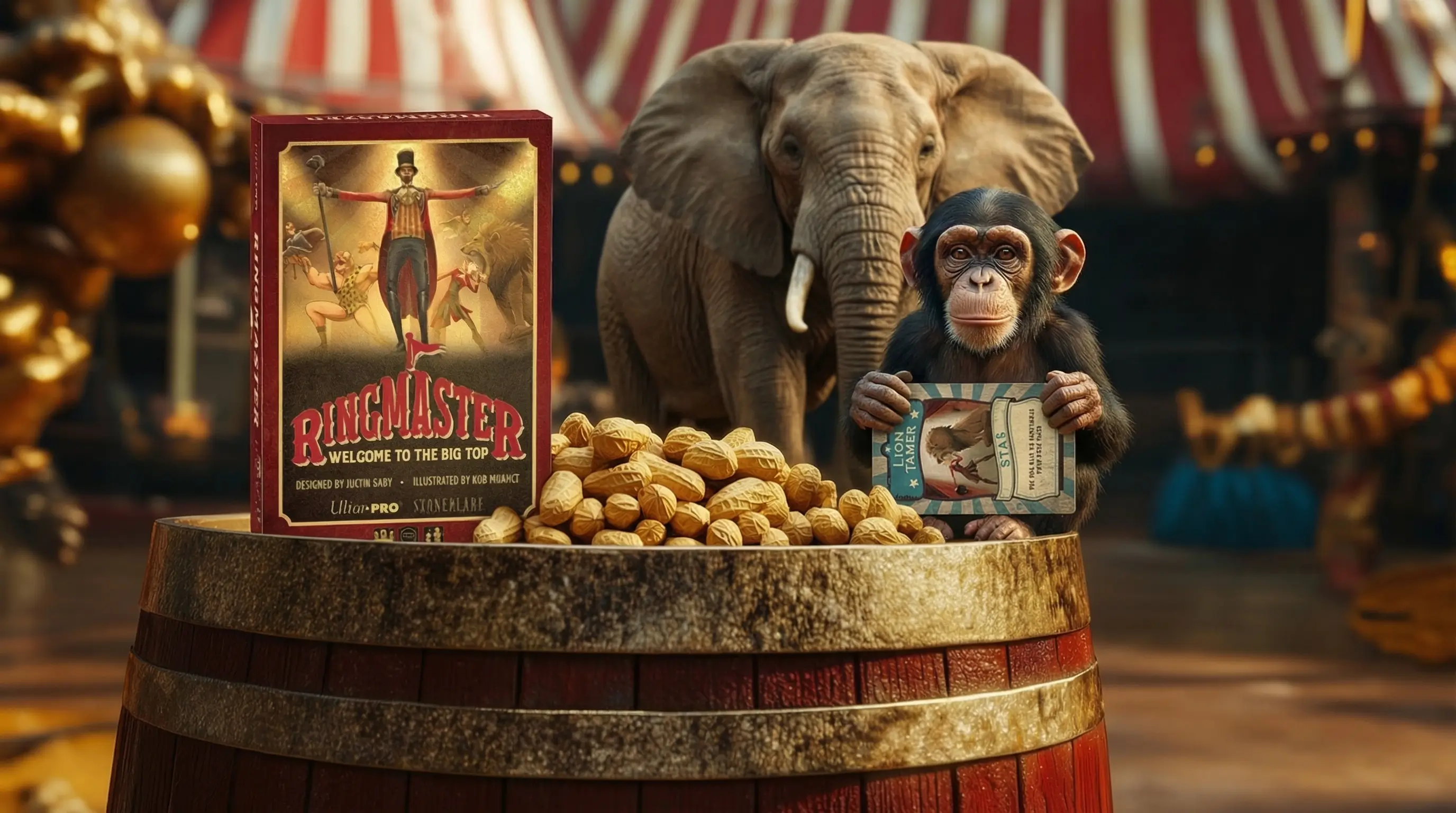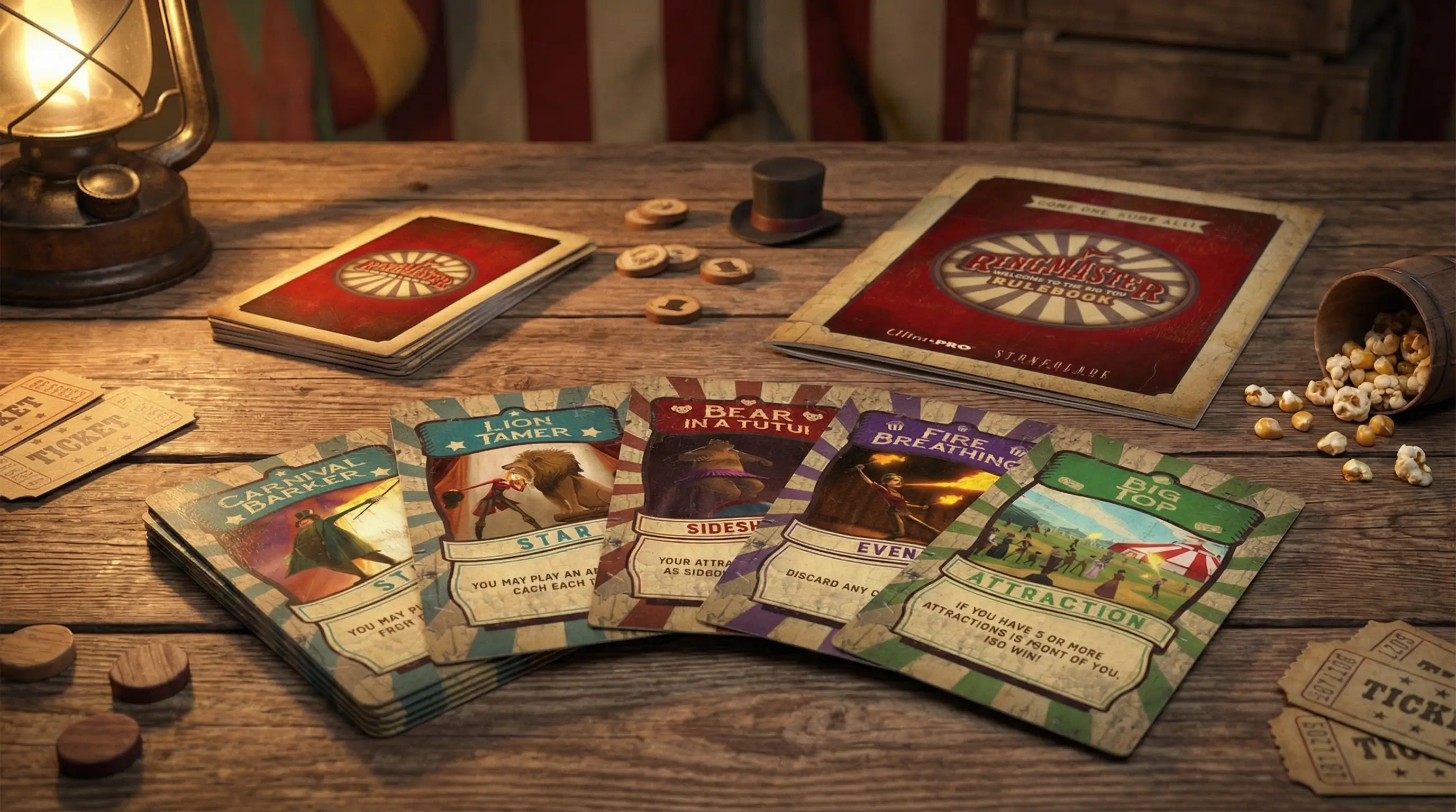 OutcomeReleased nationally through Ultra PRO in April 2019. The circus concept unified an entire game world across cards, packaging, and rulebook -- differentiating the physical object from standard box games with a cloth carry bag that arrives like a theatrical prop. The Ringmaster character at the center of the identity was illustrated by Rod Mendez, inspired in part by Denver himself.