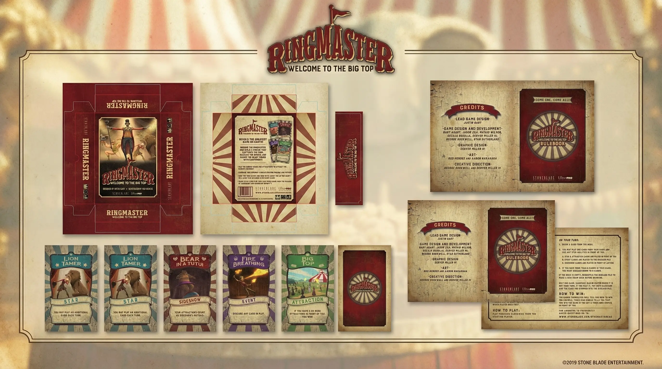 Game design and visual identity for Ringmaster: Welcome to the Big Top, a fast-paced circus-themed card game published by Stone Blade Entertainment. Responsibilities spanned concept origination, brand logo, full visual identity system, card frame and card back design, packaging, and rulebook -- with illustrations by Rod Mendez. Released nationally through Ultra PRO in April 2019 in partnership with designer Justin Gary.