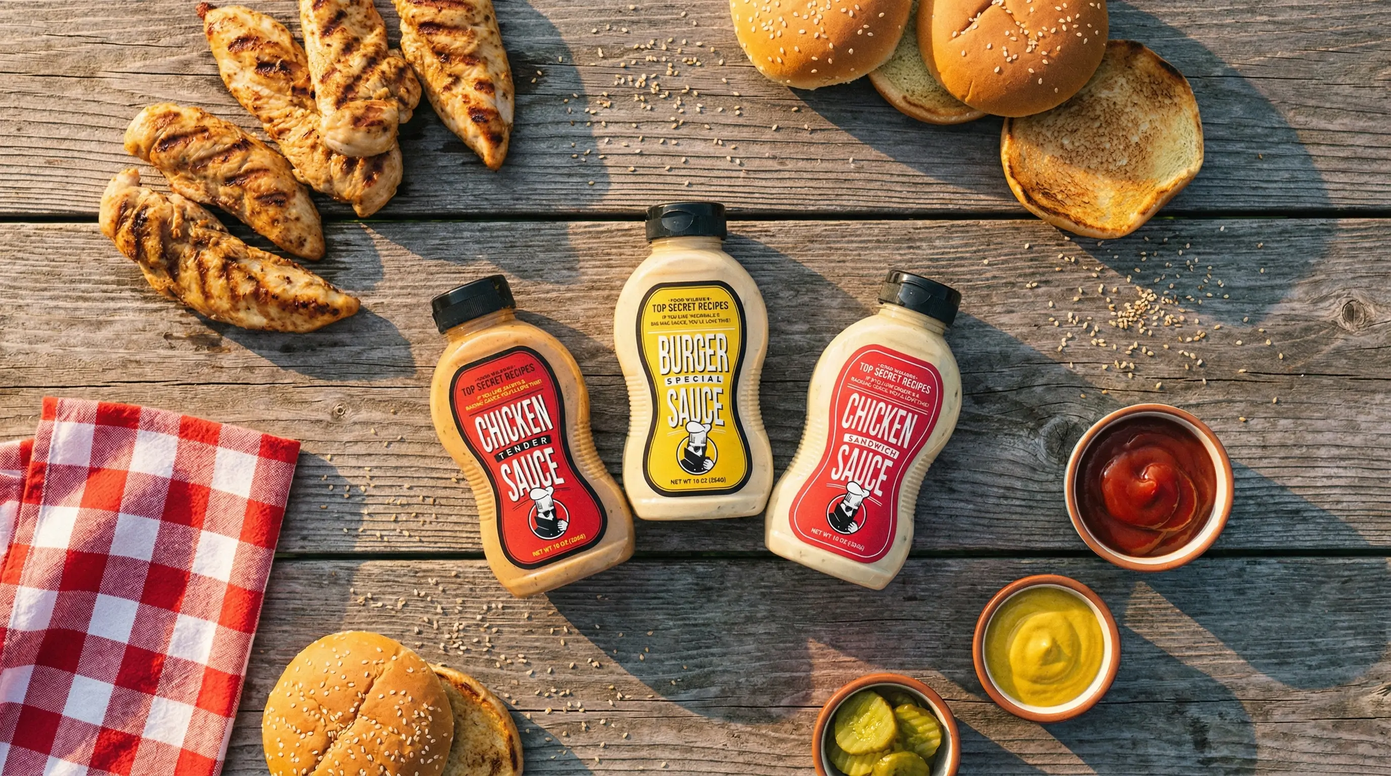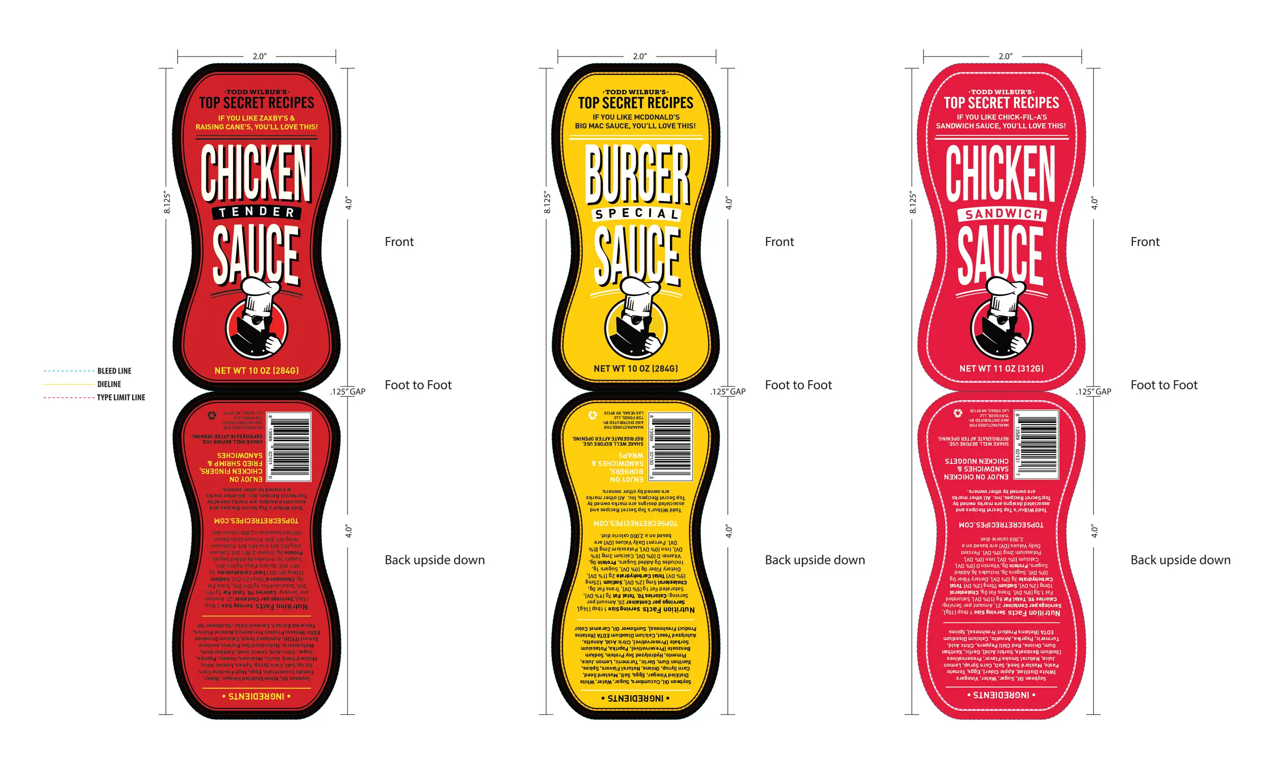 Packaging design for Todd Wilbur's Top Secret Recipes -- a three-SKU line of bottled copycat sauces built on Wilbur's bestselling recipe series. The label system had to carry an unusually direct brand premise: these sauces taste exactly like the fast food originals. Color differentiates the SKUs at shelf (red for chicken variants, gold for burger), a chef-icon medallion provides authority, and heavy display type names the original product directly -- a confidence move that turns the comparison into the pitch.